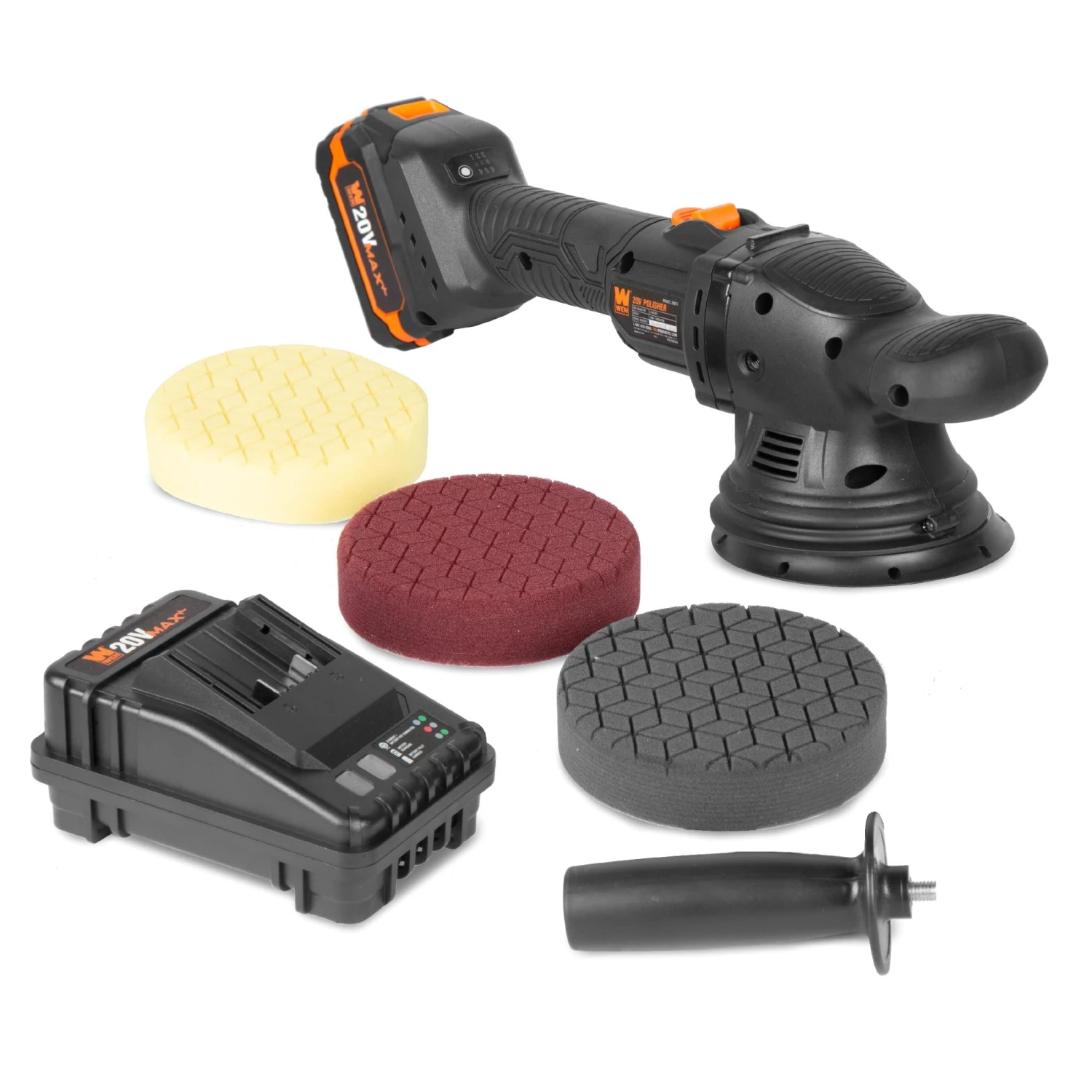 Remember when your car was the talk of the town? Get the polish and shine you deserve with the WEN 20V Max Cordless 5-Inch Dual Action Polisher and Waxer Kit with 4Ah Battery, Charger, and Polishing Pads. The six distinct speed settings range from 1800 to 5000 RPM for finishing, compounding, waxing, polishing, buffing, and rust removal all with one machine. The lock-on paddle switch limits user fatigue during long days in the garage. The easy-to-maneuver 5-inch pad fits easily into every nook and cranny of your car’s body, while the 15mm orbital throw helps make for faster jobs with streak-free finishes. This pack also includes three diamond-cut foam pads: one coarse-grit pad for removing oxidation and blemishes, one medium-grit pad for applying waxes and polishes, and one fine-grit pad for sensitive finishes. The diamond-cut pad design distributes waxes and polishes across the entirety of the pad’s surface for even application. The included fade-free 4Ah lithium-ion battery and charger eliminate the hassles of gasoline and extension cords, and minimize the amount of upkeep to keep your polisher operating smoothly. This battery is also compatible with the entire WEN 20V Cordless Power Tool Series. And because it’s a WEN product, your polisher comes backed by a two-year warranty, a stocked inventory of replacement parts, and a friendly customer help line, all to make sure you remember WEN.