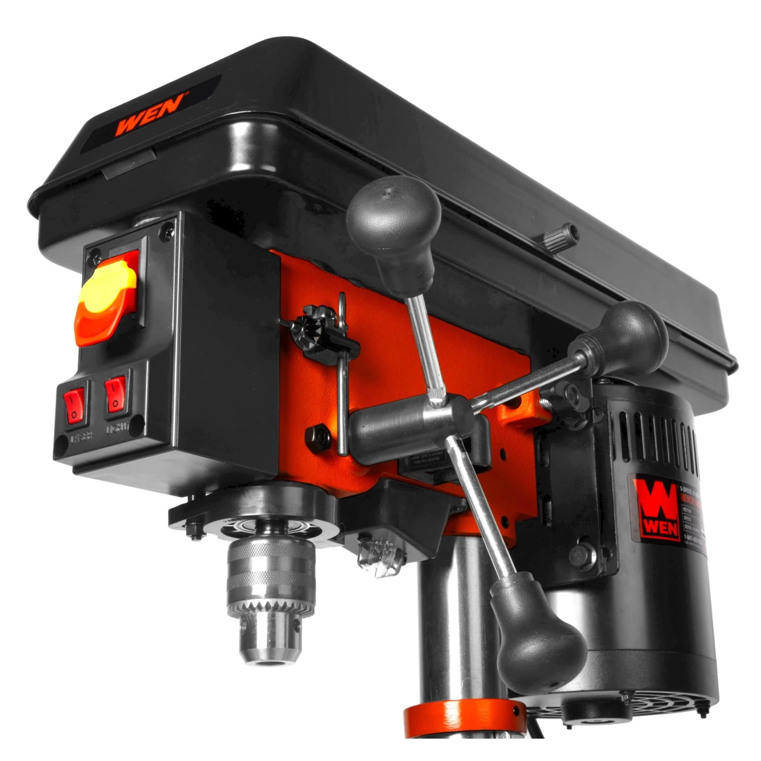 Remember when you could drill with maximum accuracy? Power through metal, wood, plastics, and more with the WEN 10-Inch 5-Speed Drill Press. Don’t let our compact design fool you. Between the five operating speeds, the 2-inch spindle travel, and the sturdy construction, you’ll have way more precision than a standard handheld drill. Our 6.2-amp induction motor features ball bearings for smooth, balanced performance, even at high speed. Easily set your speed to either 630, 1100, 1800, 2450, or 3300 RPM by adjusting the belt position on the two pulleys. The easy-to-read, locking depth stop allows for accurate and repeatable drilling operations. The chuck with JT33 spindle taper accepts bits ranging from 1/16 to 1/2 inch in diameter (1.5 to 13 mm). The X-pattern laser pinpoints the drill location, eliminating guesswork and sparing expensive materials, while the LED light illuminates your work. The table bevels 45° left and right for angled drilling. The base is designed with slots for mounting onto a bench or work stand. Clamps and vises are easily mounted to the slotted table, making work-holding safe and effective. And because it’s a WEN product, your 10-inch drill press comes backed by a two-year warranty, a stocked inventory of replacement parts, and a helpful customer phone line. Remember when you could drill holes in almost anything? Remember WEN.